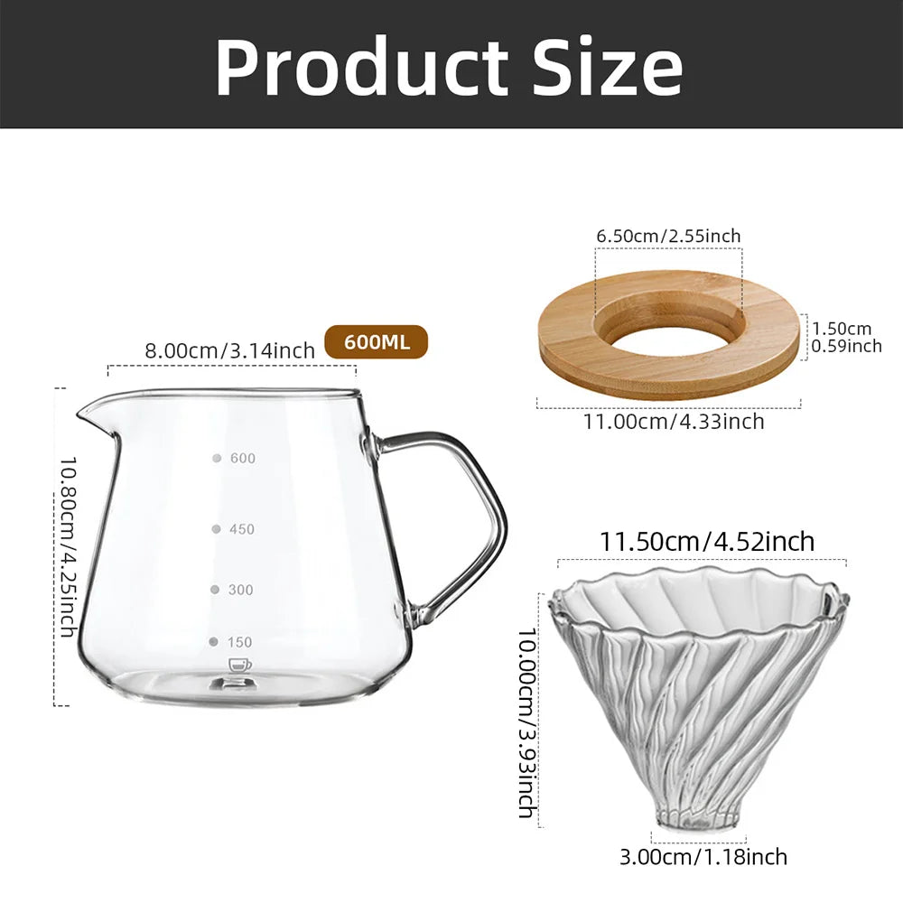- Dimensions: cafetière: 8cm x 10,8cm; filtre: 10cm x 8,5cm x 3,5cm; support en bois: 11cm x 6,5cm x 1,5cm